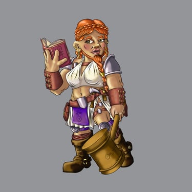 This character is a female dwarf cleric, hailing from a proud lineage of mountain dwellers. She has a stout and sturdy build, with a long beard braided intricately. Her armor is adorned with symbols of her deity, and she wields a warhammer with great skill. She possesses strong faith and a deep connection to the divine, using her healing magic to mend wounds and protect her allies in battle. She carries a tome of ancient scriptures, containing the wisdom of her ancestors.