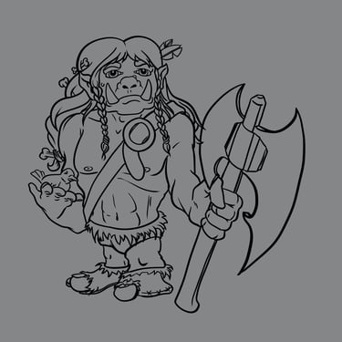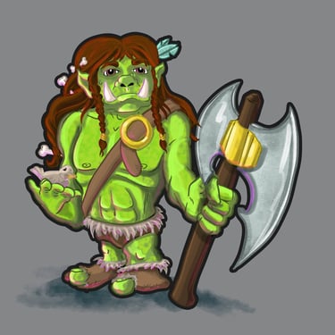 Half-Orc Barbarian: This character is a half-orc barbarian, born of mixed heritage. They have a powerful and muscular build, with green skin and prominent tusks. Their long, unruly hair is braided with feathers and bones. They wear minimalistic leather armor and wield a massive greataxe, capable of cleaving through enemies with brutal force. They channel their inner rage into battle, becoming a force of unstoppable fury on the battlefield. Despite their intimidating appearance, they possess a gentle heart and strive for acceptance and understanding in a world that often judges them based on their race.