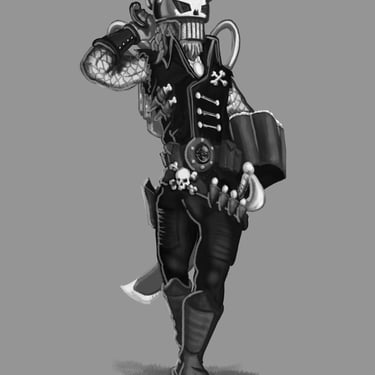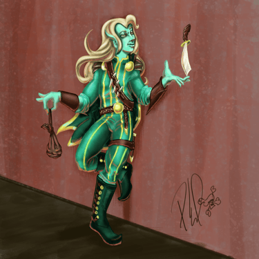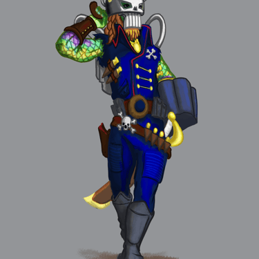 This character is a captain of a space pirate crew who travels the galaxy in search of treasure and adventure. They wear a flamboyant outfit made of leather and rubber, and their trusty blaster is never far from reach. They have a humanoid form, but their skin is covered in iridescent scales that change color based on their mood. The traditional eye patch has been replaced with a high tech heads up display to aid in battle and space navigation. They are also a skilled fighter and strategist, able to lead the crew to victory against any foe.