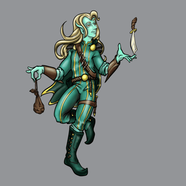 This character is a male elf rogue, hailing from a mystical woodland realm. He possesses an agile and slender frame, with long, flowing hair and piercing green eyes. His attire consists of dark, form-fitting leather armor, ideal for stealth and mobility. He is a master of deception and quick reflexes, using his dual daggers to strike swiftly and silently. He is skilled in thievery, lock-picking, and acquiring valuable information. He has a mysterious past and a charming demeanor that makes him adept at both blending into the shadows and charming his way into unsuspecting hearts.