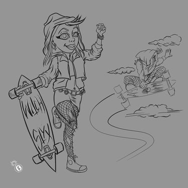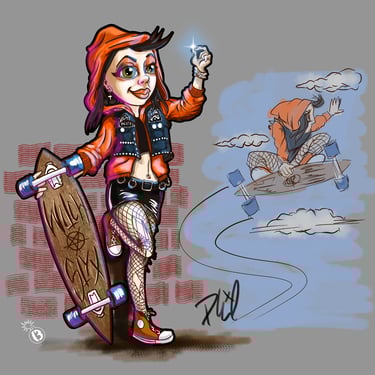 Valeri. She's a Deathrock Valley girl witch from Northridge. With a love of halloween, and all things L.A. Deathrock, she rides the skies of the O.C. on her Witch Styx longboard jamming to the likes of 45 Grave, and Cristian Death ( Rozz Version) She rides, because no one walks in LA.